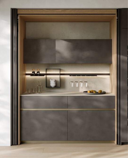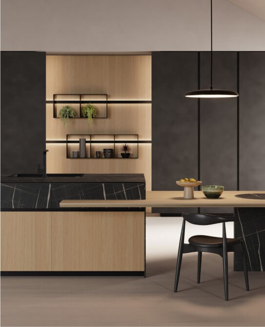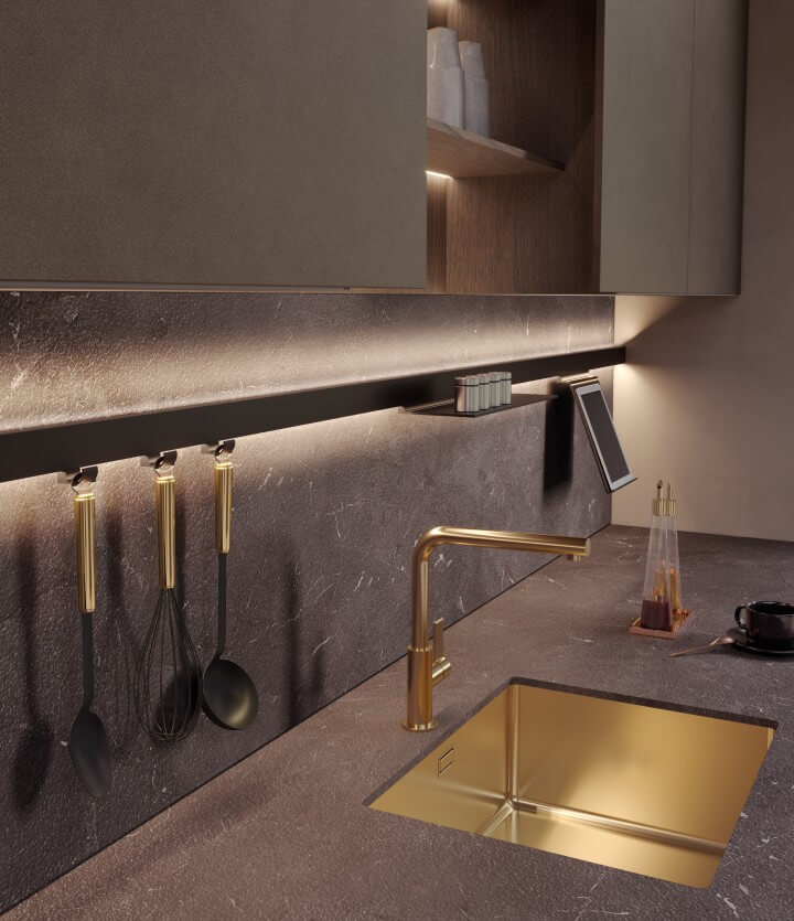 Profilo in alluminio anodizzato nero, che può essere integrato con una serie di accessori che contribuiscono ad arredare e dare servizio in cucina.