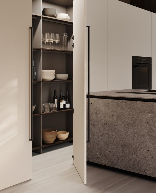 Cabina Wall offre uno spazio contenitivo da accessoriare a piacimento per diventare dispensa, spazio dove riporre piccoli elettrodomestici, zona lavanderia, oppure ripostiglio.