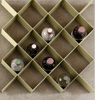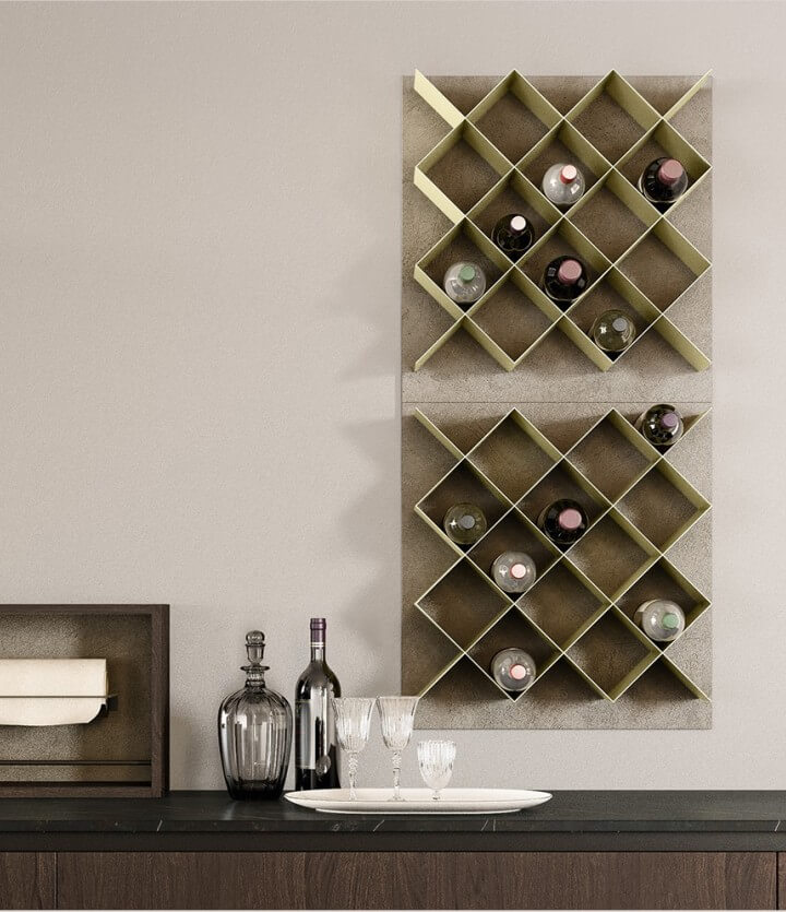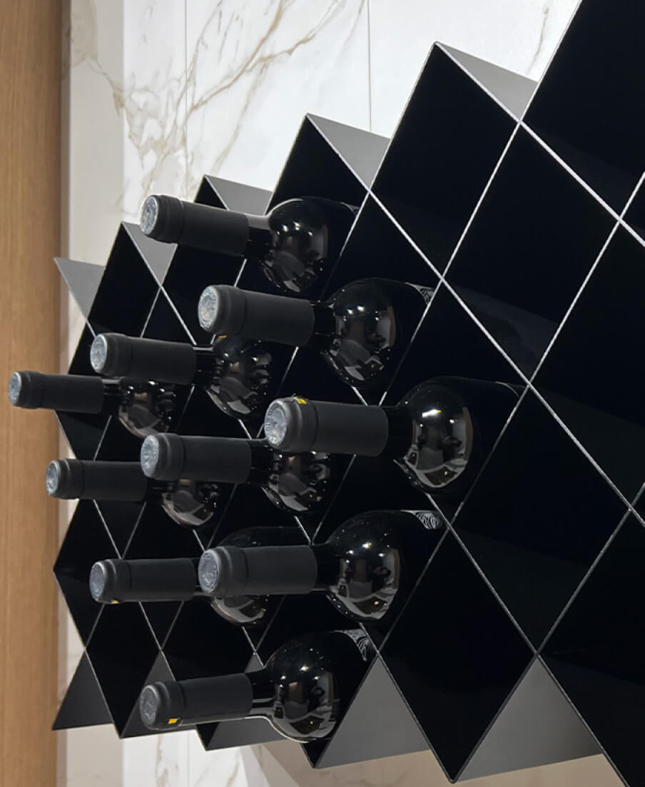 X-BACCO, un incastro di metallo che forma degli spazi ritmati, fissato ad un pannello personalizzato dalle svariate finiture. Un elemento di design dove esporre bottiglie sempre a portata di mano.